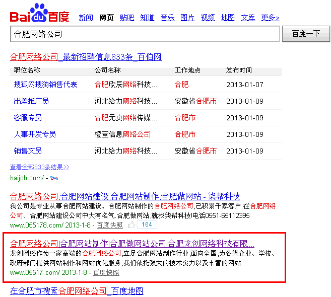 經(jīng)過(guò)我公司技術(shù)人員的一致努力,目前,百度搜索“合肥網(wǎng)絡(luò)公司”一詞,我們的網(wǎng)站www.javamvc.cn 已躍至百度排名第二位。以下是2013年1月8日的百度搜索截圖: